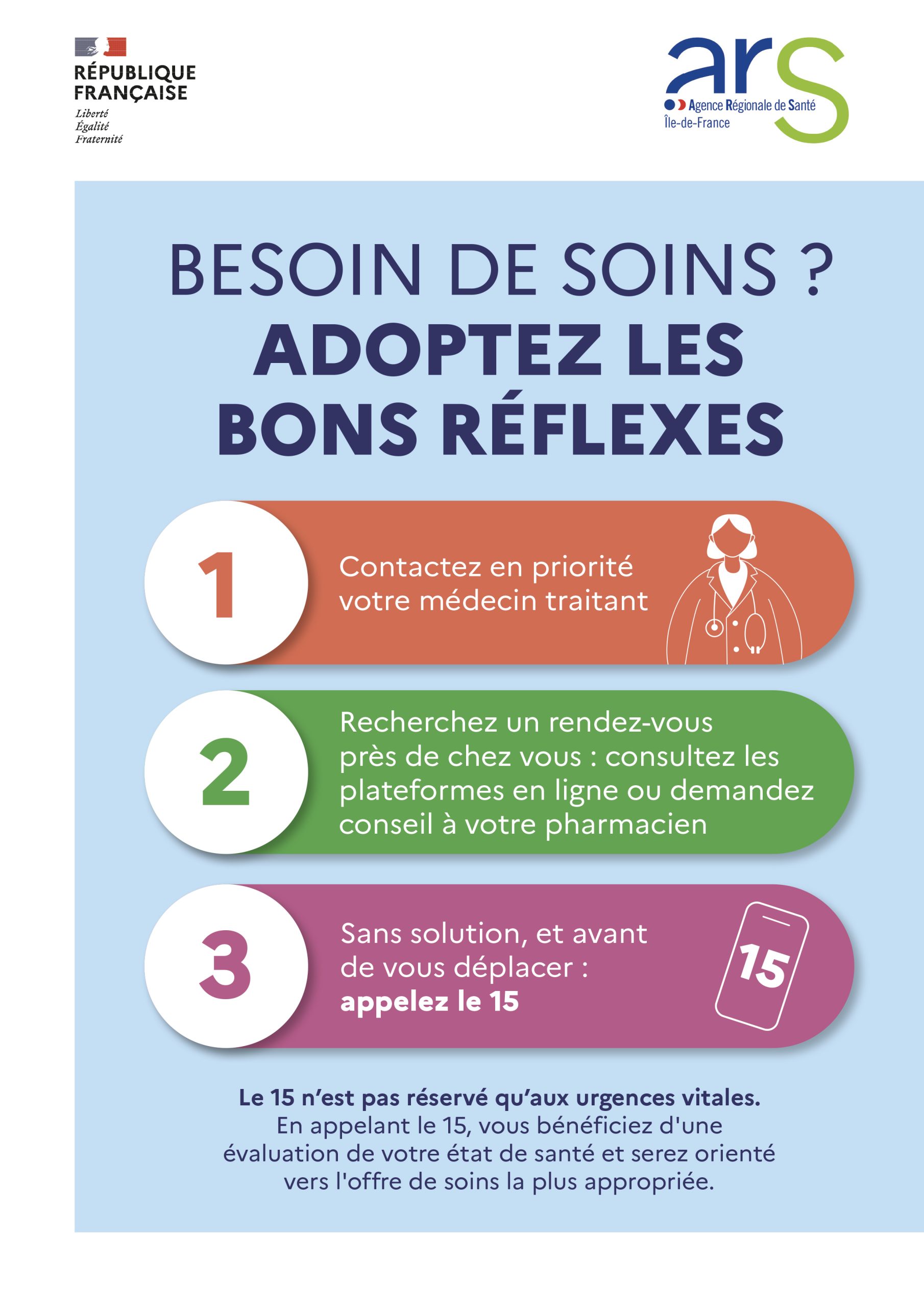 Dans ce contexte, l’Agence régionale de santé (ARS) Île-de-France et l’Assurance Maladie poursuivent leur campagne régionale afin de rappeler le bon usage des services d’urgence et des dispositifs de soins non programmés, et de faire connaître un réflexe essentiel : appeler le 15 avant de se déplacer.