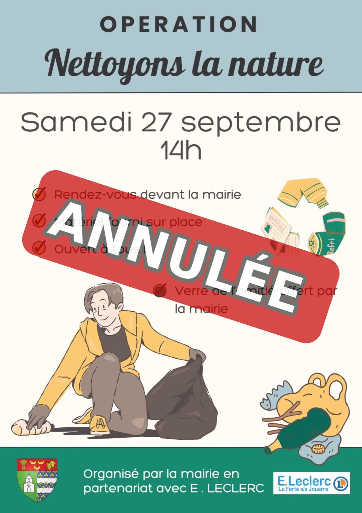 Nous vous informons que l’opération « Nettoyons la nature », initialement prévue le samedi 27 septembre, est annulée pour des raisons logistiques.