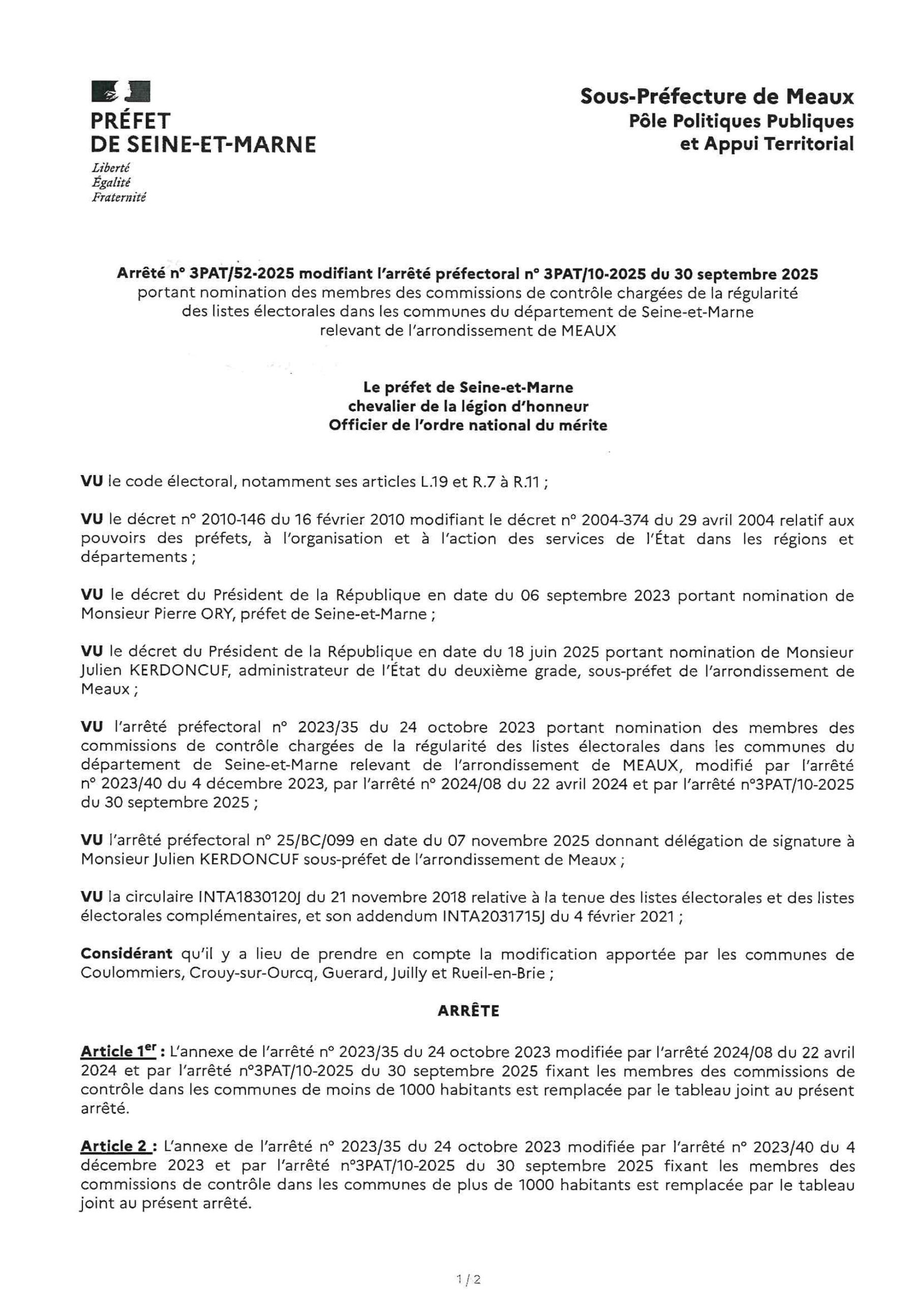 Arrêté n° 3PAT/52-2025 modifiant l’arrêté préfectoral n° 3PAT/10-2025 du 30 septembre 2025 portant nomination des membres des commissions de contrôle chargées de la régularité des listes électorales dans les communes du département de Seine-et-Marne relevant de l’arrondissement de MEAUX