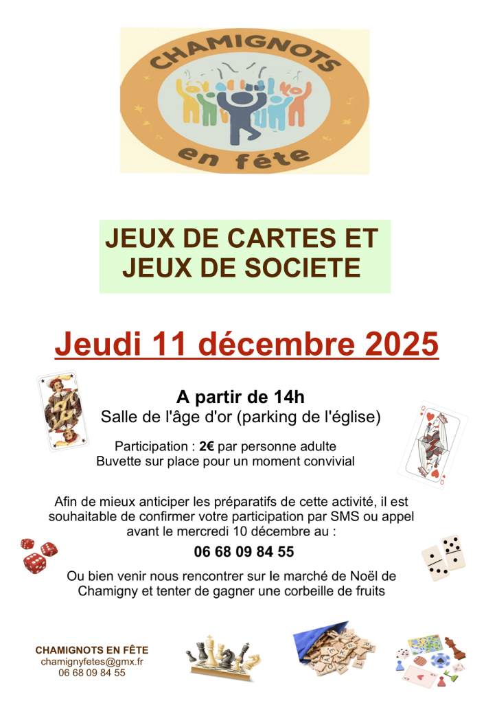 L’association Chamignots en fête organise un après-midi dédié aux jeux de cartes et aux jeux de société, placé sous le signe de la convivialité et du partage.