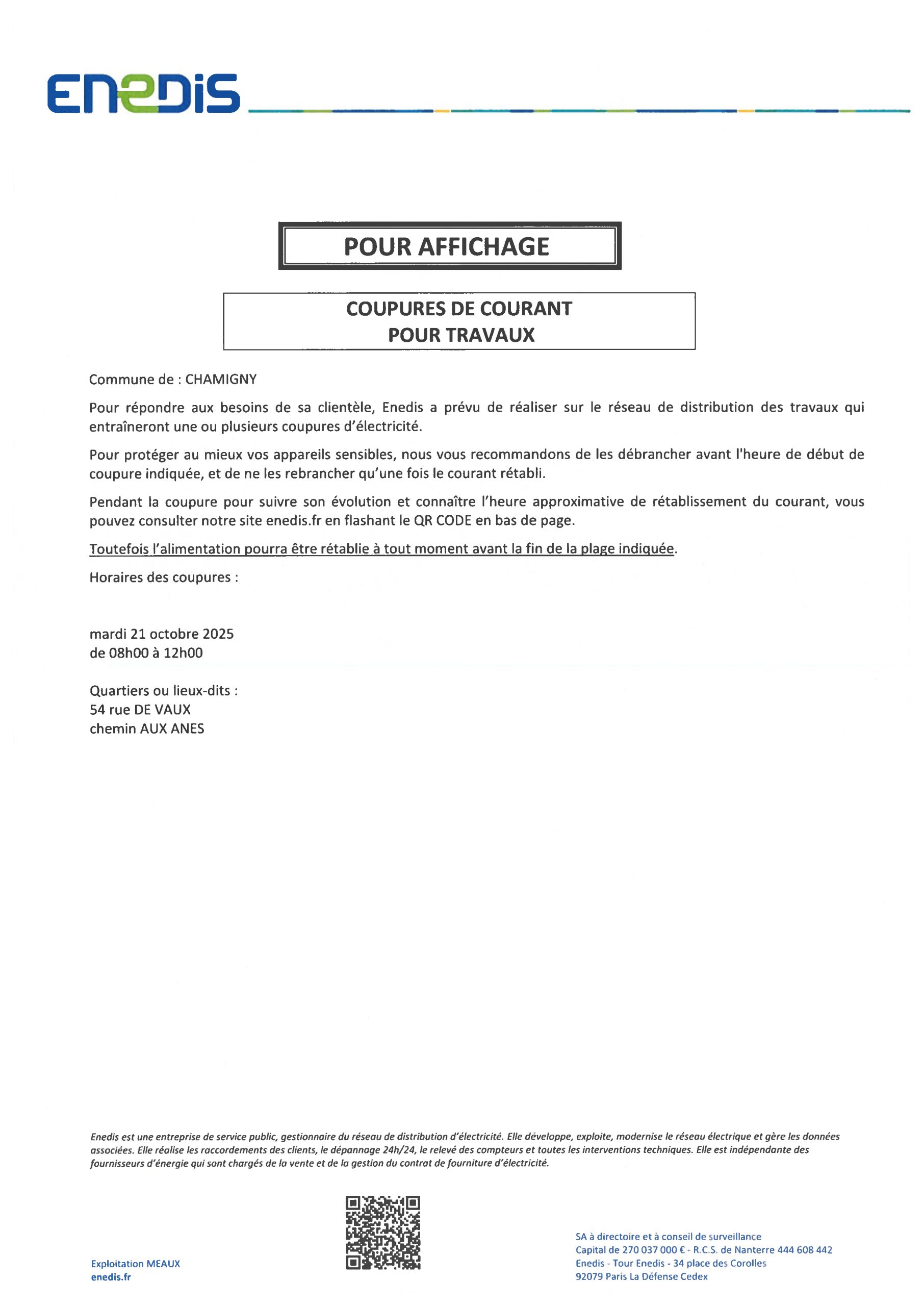 Enedis nous informe d’une intervention sur le réseau de distribution entraînant des coupures de courant à Chamigny.