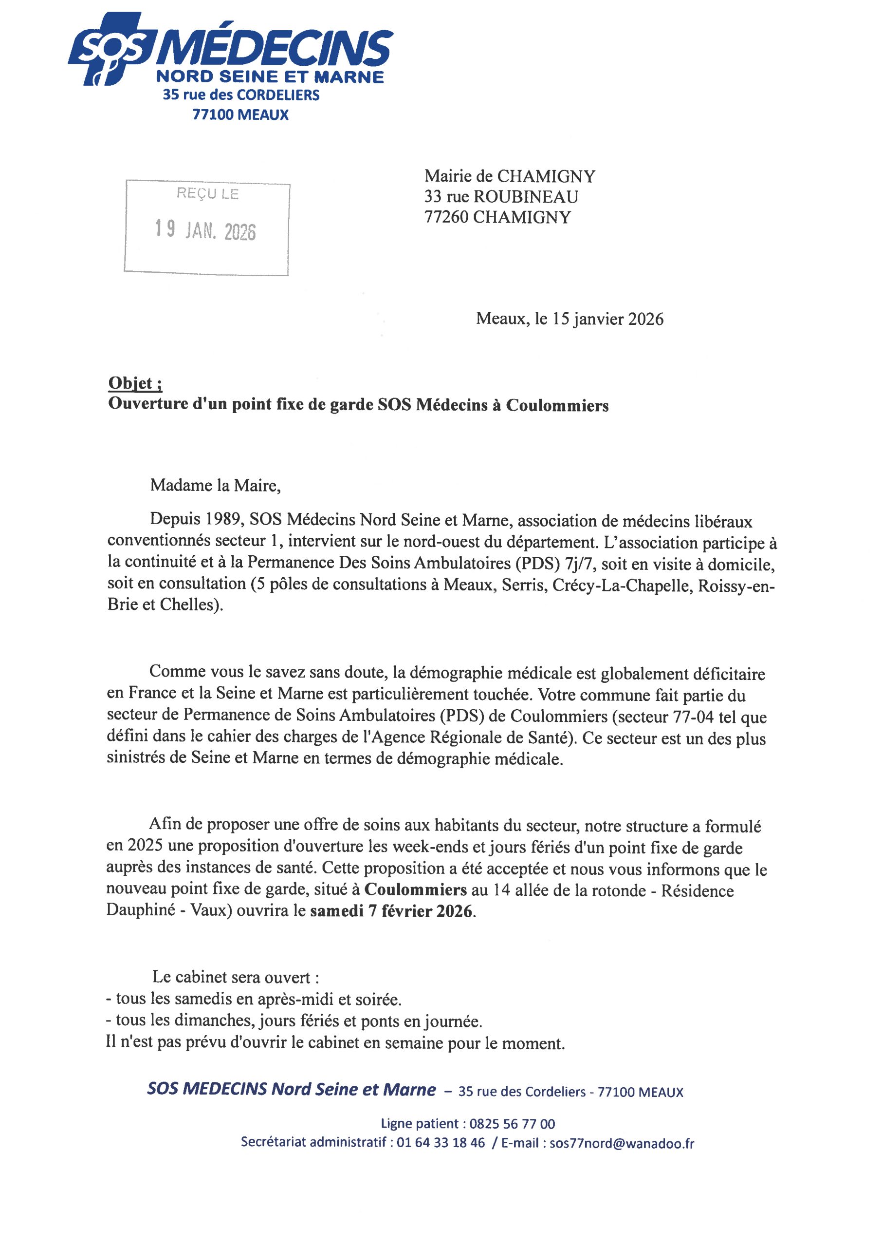 Afin de renforcer l’accès aux soins non programmés sur le secteur, SOS Médecins Nord Seine-et-Marne ouvre un point fixe de garde à Coulommiers à compter du samedi 7 février 2026.