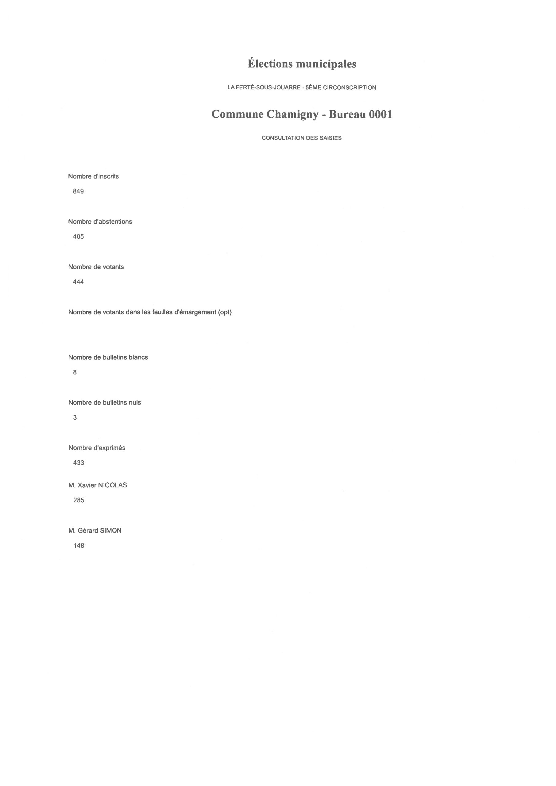 Suite au premier tour des élections municipales et communautaires du dimanche 15 mars 2026, voici les résultats du scrutin pour la ville de Chamigny :