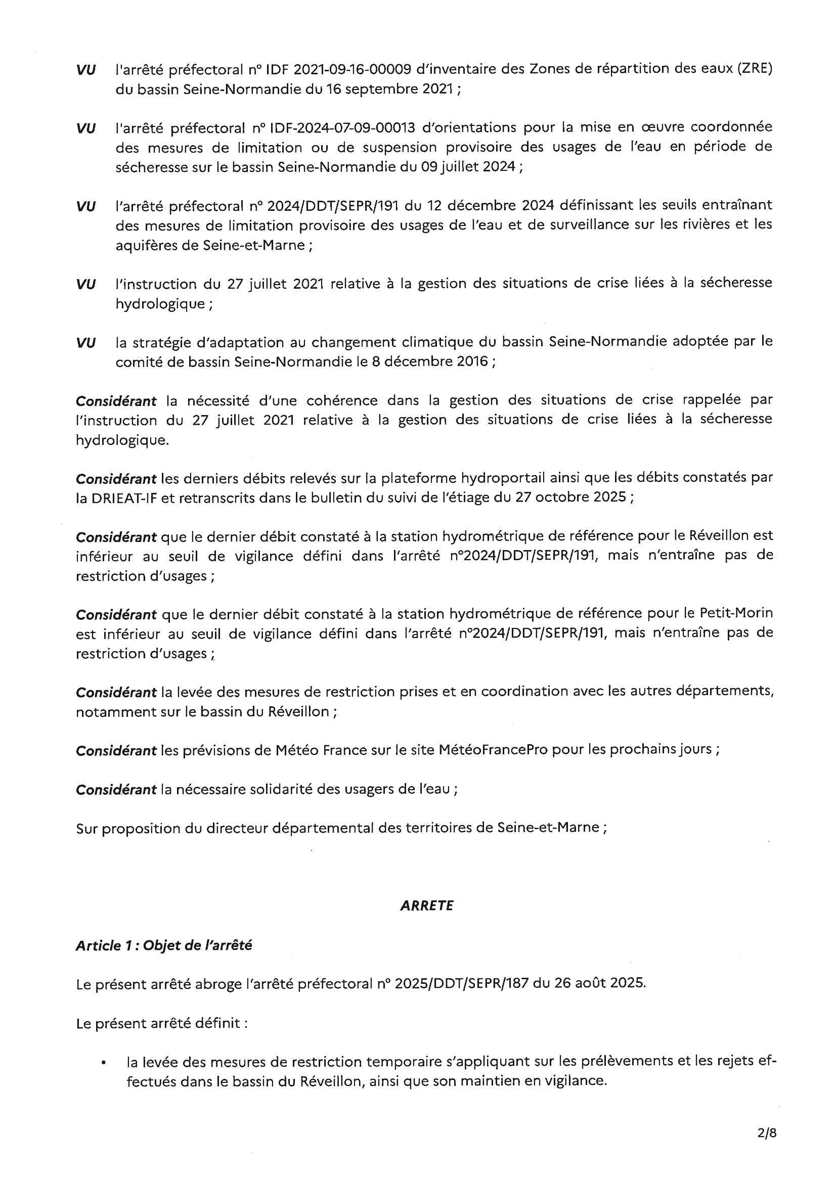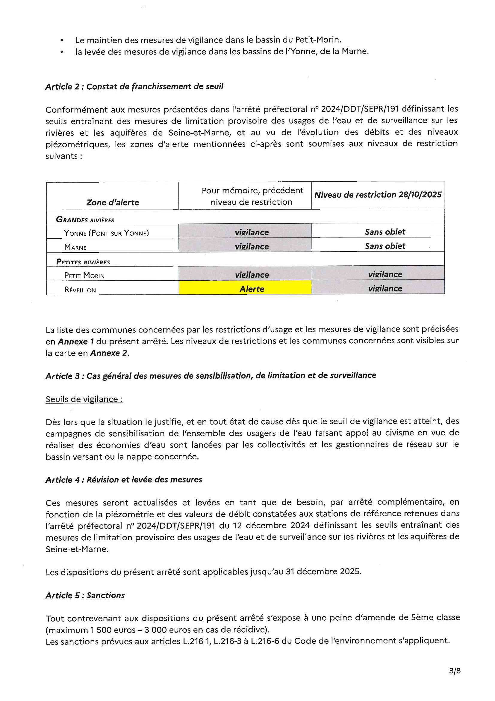 Désormais, seuls les bassins du Réveillon et du Petit Morin demeurent placés en vigilance. Sur ces secteurs, des mesures d’économie d’eau continuent de s’appliquer.