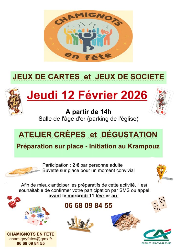 L’association Chamignots en fête vous invite à partager un moment convivial à Chamigny autour de jeux de cartes et de jeux de société, suivi d’un atelier crêpes et dégustation.